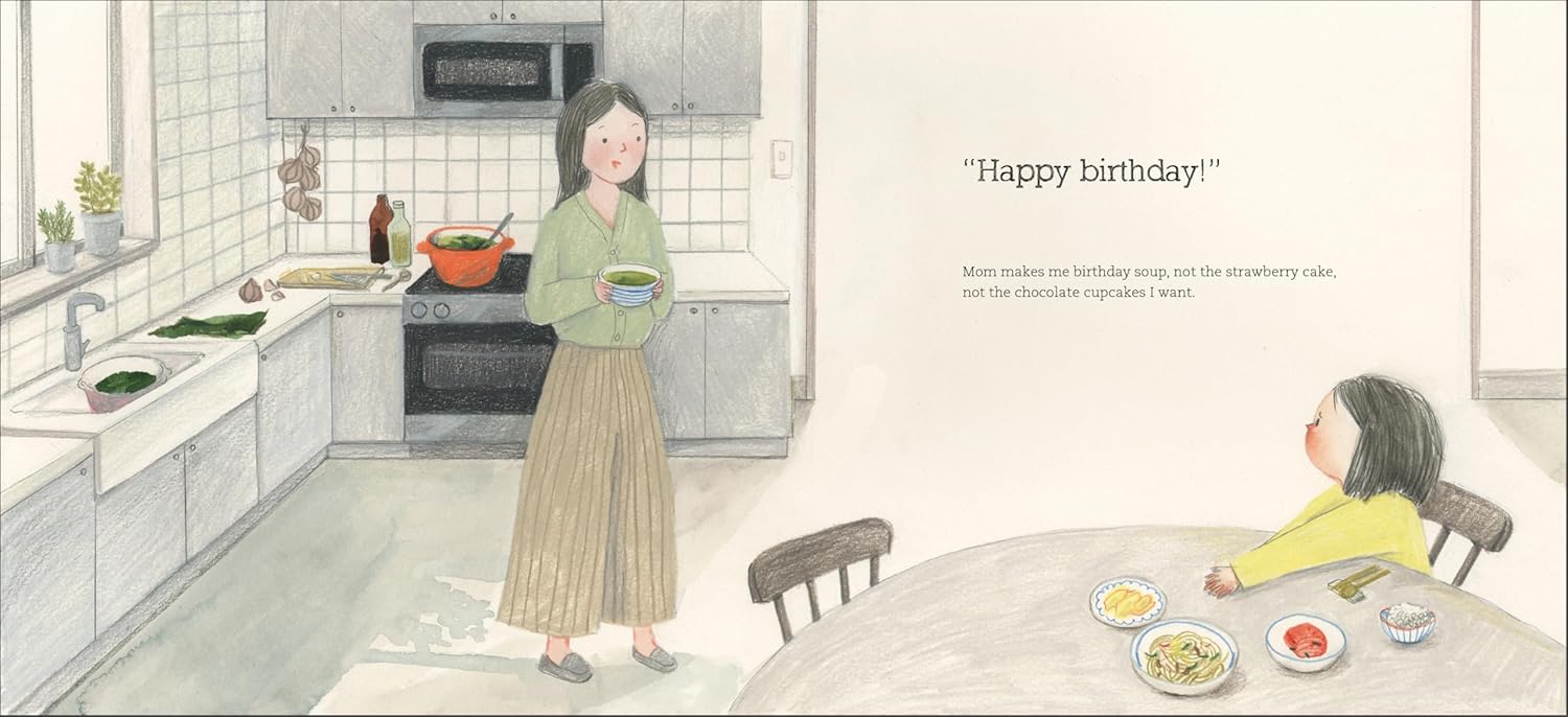 On her birthday, a girl is presented with a bowl of miyeokguk, seaweed soup—instead of the cake she wants. As she stirs her soup, her mother tells her how mothers eat it after giving birth and how it is served on birthdays to honor them; about haenyeo, women who dive into the ocean’s depths to harvest shellfish and seaweed; and how, many mothers ago, a pregnant haenyeo saw a whale eating seaweed after giving birth and tried it after having her own baby—creating a tradition that would continue for generations of daughters to come.