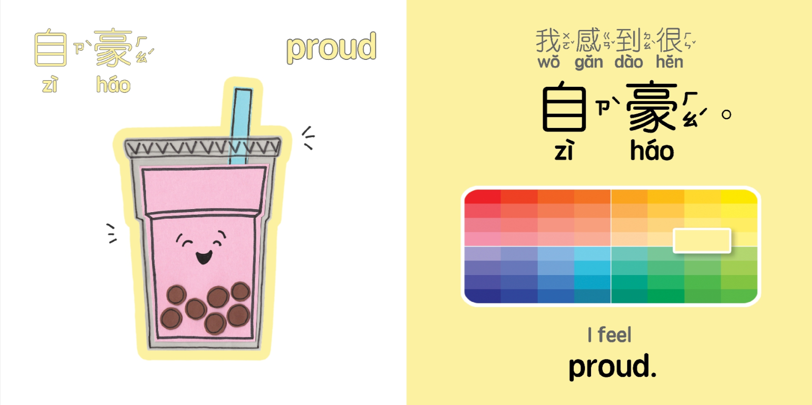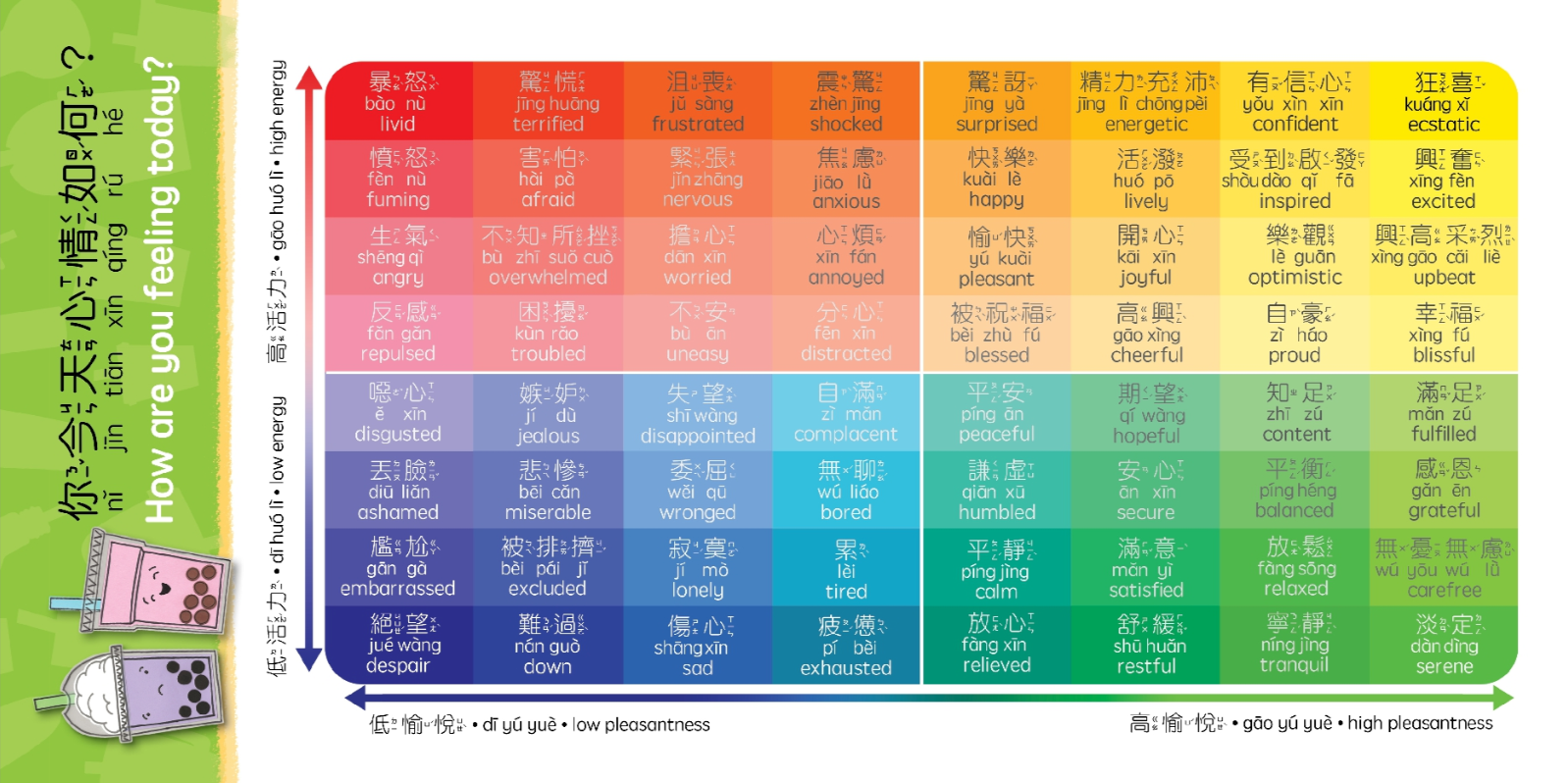 Boba Emotions squeezes in lots of extra learning opportunities and skills, such as practice with observation and reenactment skills as children discover and act out emotions while reading and understanding a graph. Also included is a bilingual chart including a range of 64 emotions organized on a grid, showcasing a spectrum of pleasantness and energy levels.