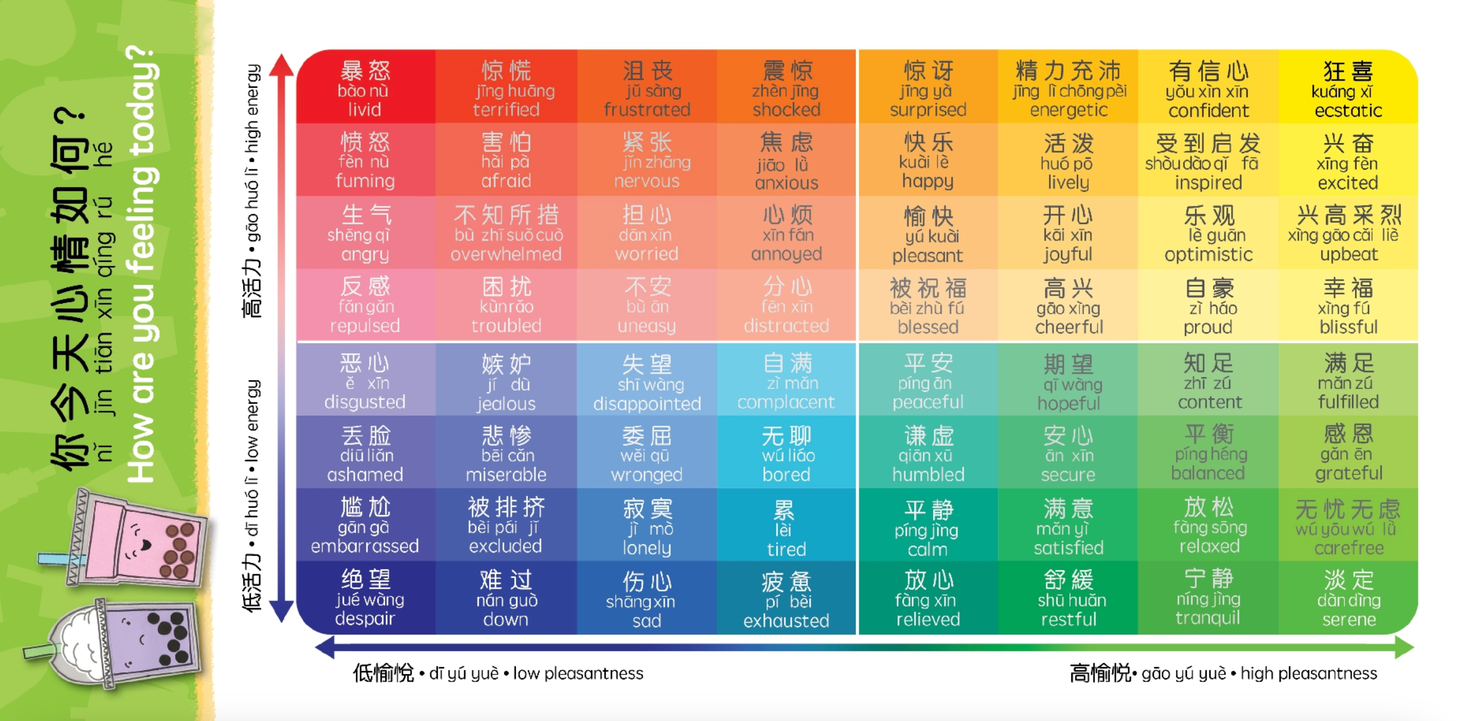 Boba Emotions squeezes in lots of extra learning opportunities and skills, such as practice with observation and reenactment skills as children discover and act out emotions while reading and understanding a graph. Also included is a bilingual chart including a range of 64 emotions organized on a grid, showcasing a spectrum of pleasantness and energy levels.