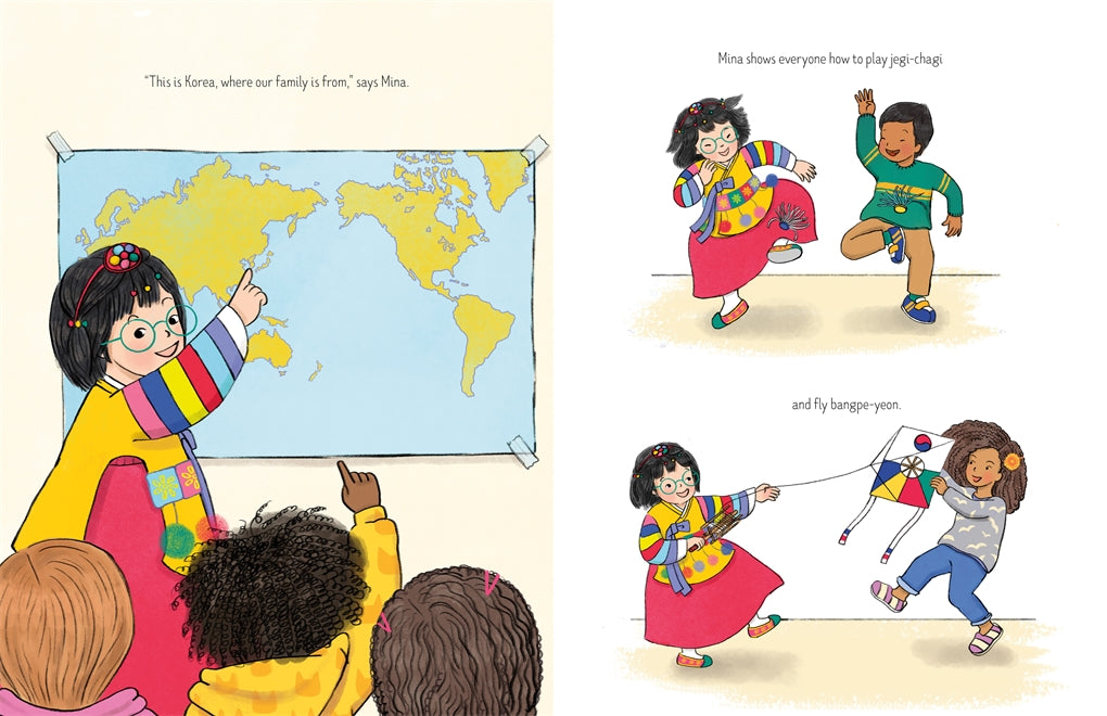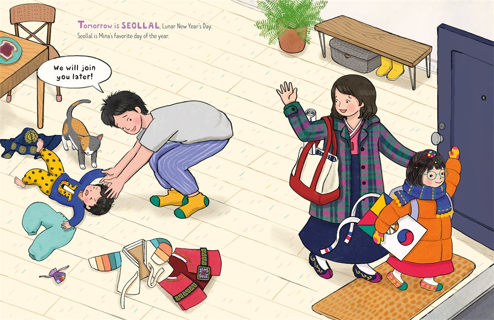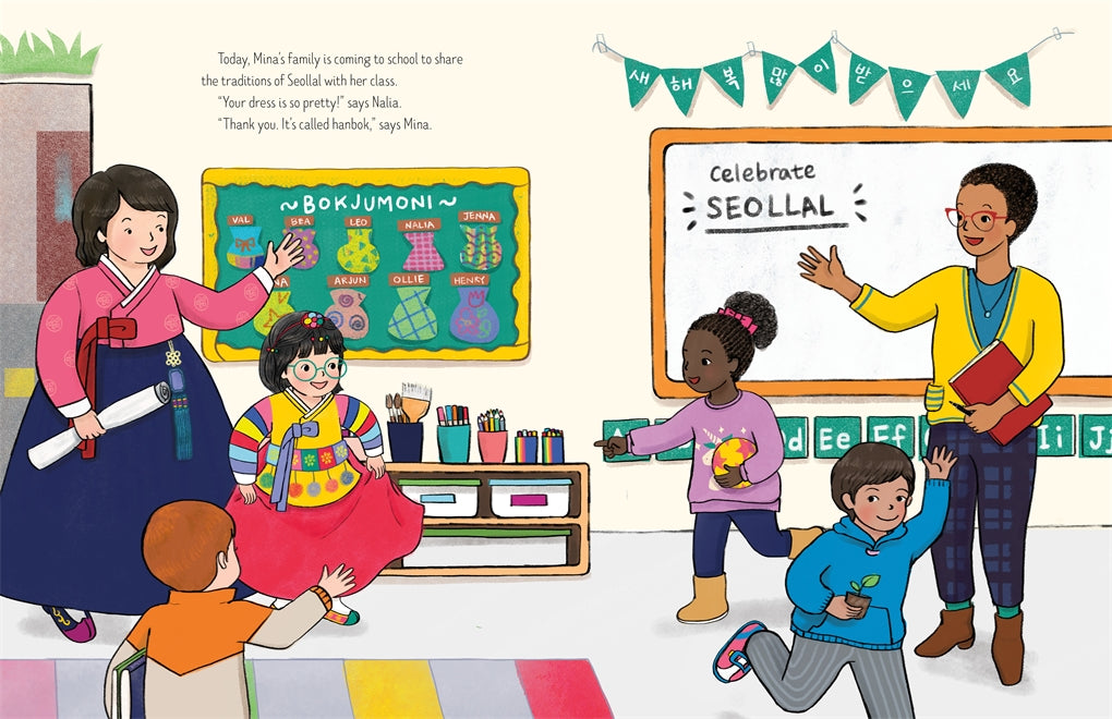Mina can't wait to share the customs of Seollal with all of her friends at school. She will show her classmates her colorful hanbok, demonstrate how to do sebae, and then everyone will make tasty tteokguk in the cooking room. Yum! Her little brother may even join in on the fun… if he can find a way out of his bad mood.