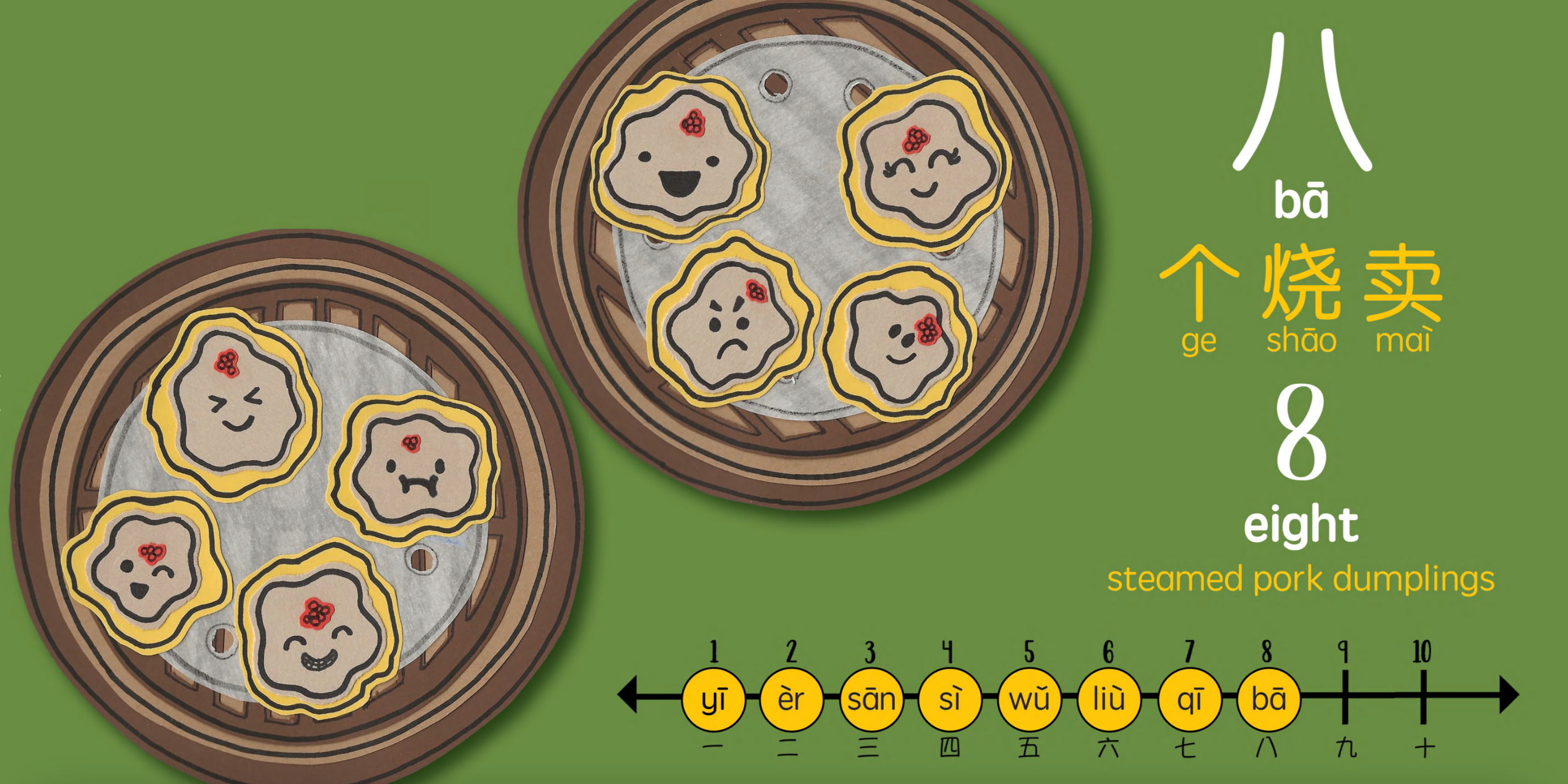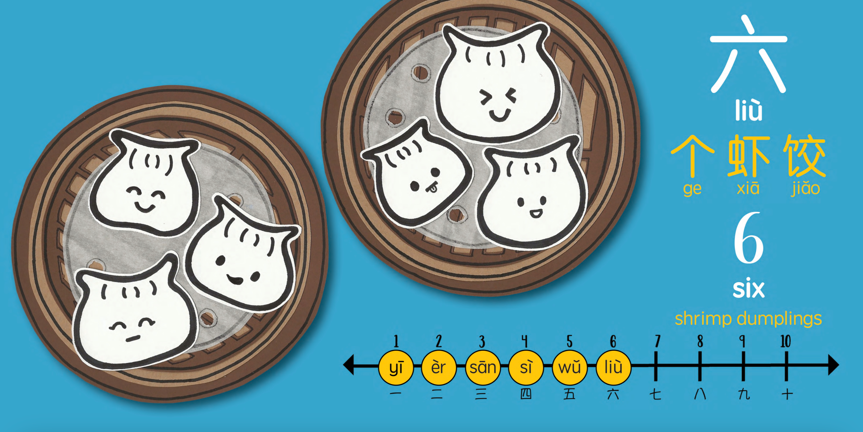 Our counting book squeezes in extra learning opportunities and skills, such as encouraging one-to-one correspondence while practicing counting on a numberline, extra fun facts about Chinese language, and a non-fiction page with real-life pictures of dim sum items in the picture glossary.