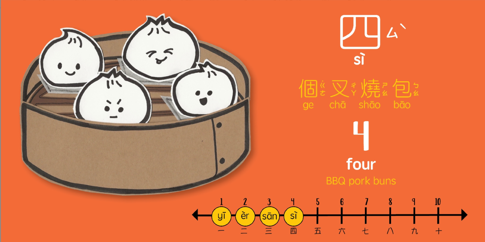 Our counting book squeezes in lots of extra learning opportunities and skills, such as encouraging one-to-one correspondence while practicing counting on a numberline, extra fun facts about Chinese language, and a non-fiction page with real-life pictures of dim sum items in the picture glossary.