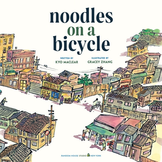 A vibrant historical picture book about Tokyo's bicycle food deliverers, or demae, who balanced towering trays of steaming hot noodles on their shoulders while navigating crowded city streets.