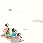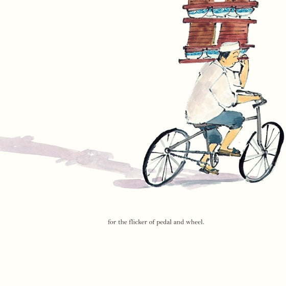 When the deliverymen set off in the morning, the children wait for the flicker of pedal and wheel. It's the demae-- delivery men-- setting off to deliver steaming trays of noodles to hungry customers all over the city. They are acrobats: whizzing past other bicycles, soaring around curves, avoiding the black smoke of motorcycles. When the children see them, they want to be them. And so they practice with bowls of wobbling water stacked on trays. The day passes, and, finally, exhausted, the demae return home, to their families, and, yes, to steaming bowls of noodles.