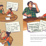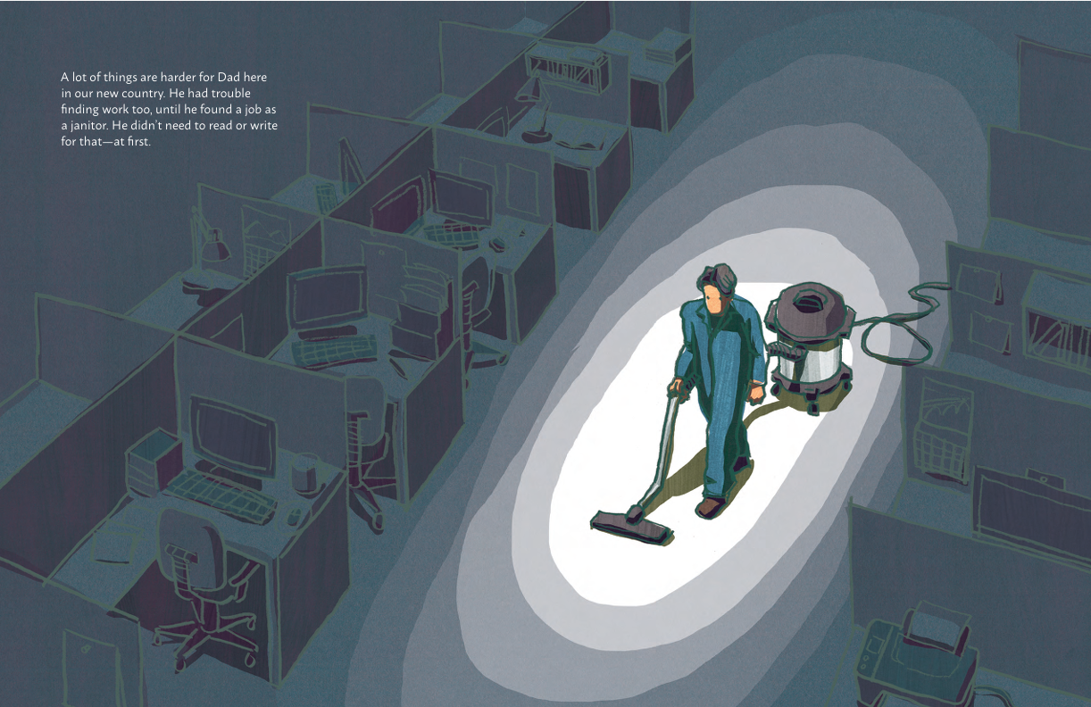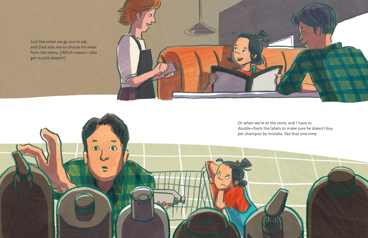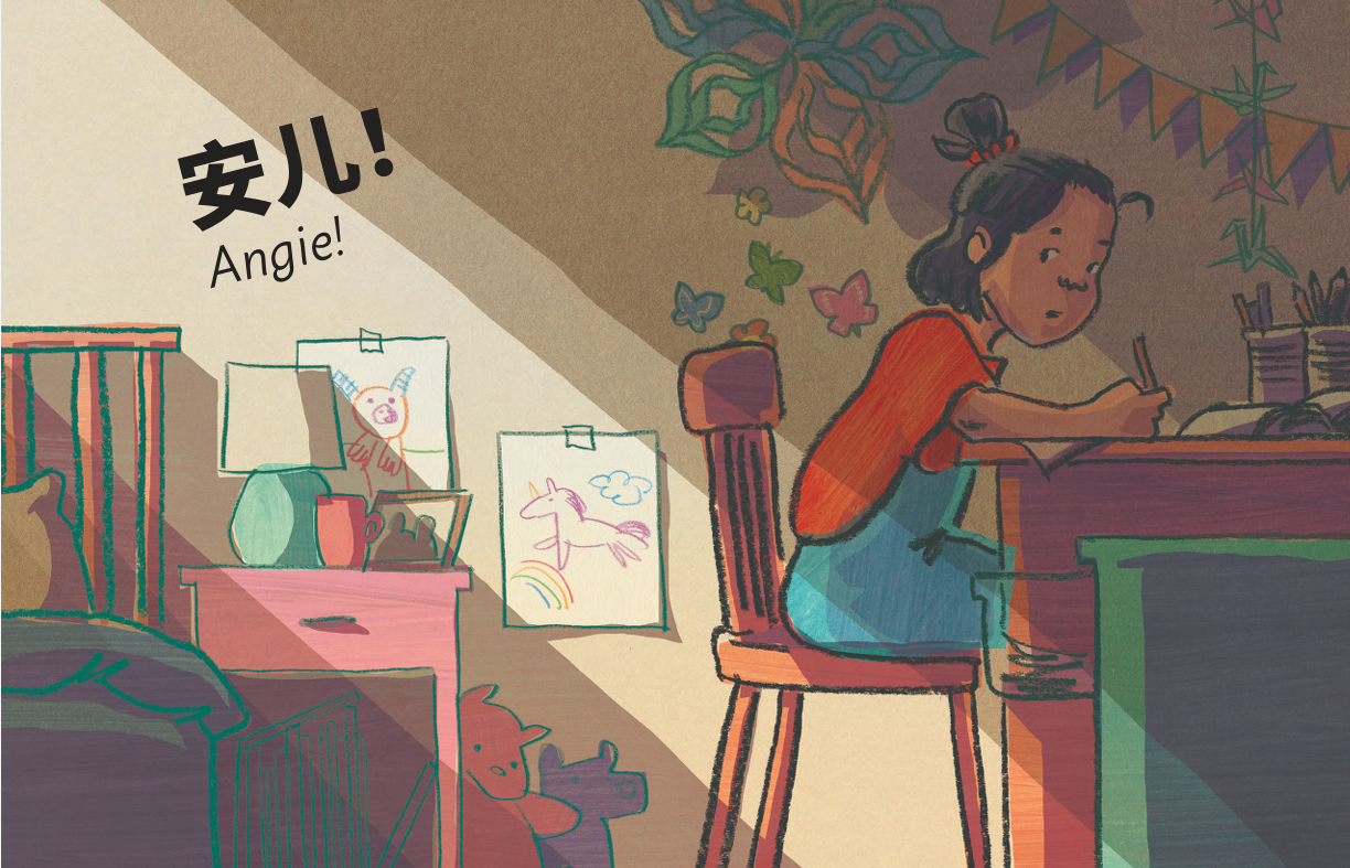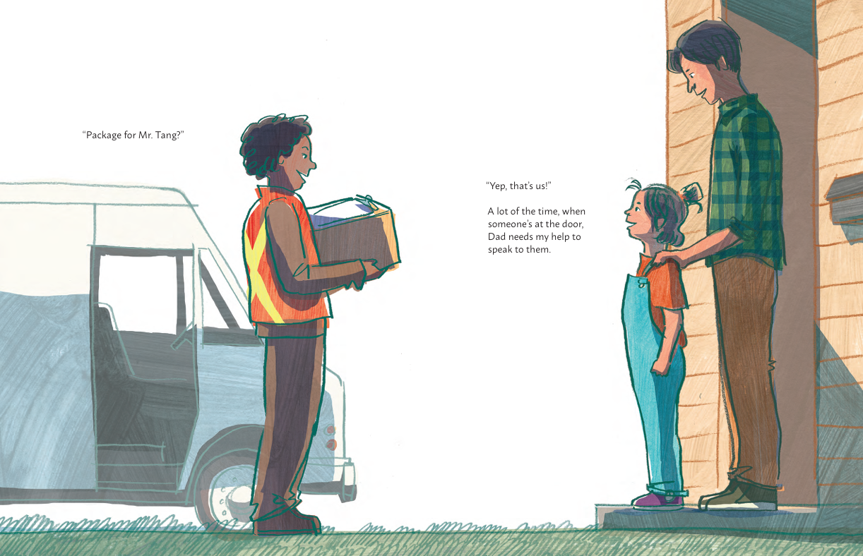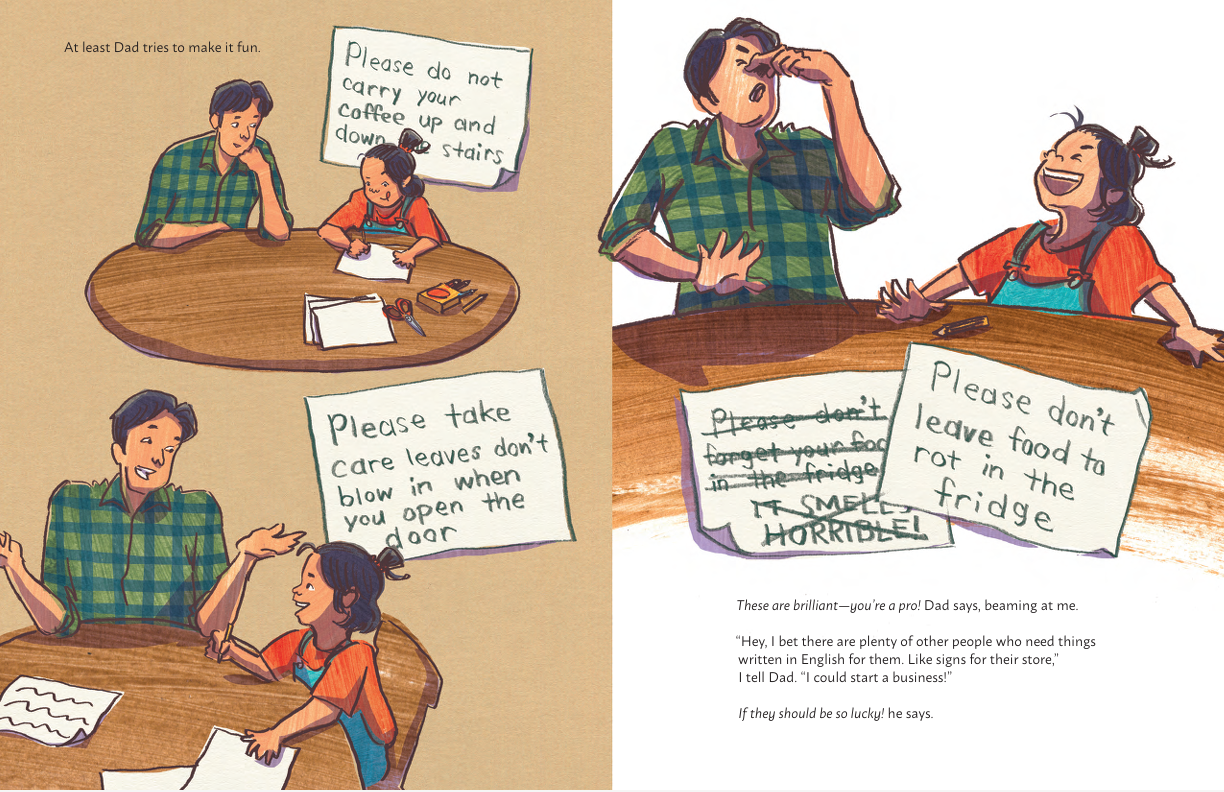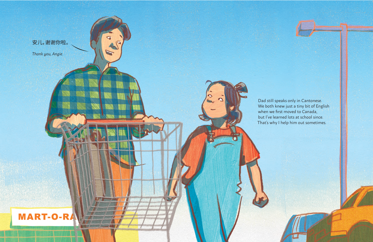 Angie is used to helping her dad. Ever since they moved to Canada, he relies on her to translate for him from English to Chinese. Angie is happy to help: when they go to restaurants, at the grocery store, and, one day, when her dad needs help writing some signs for his work.